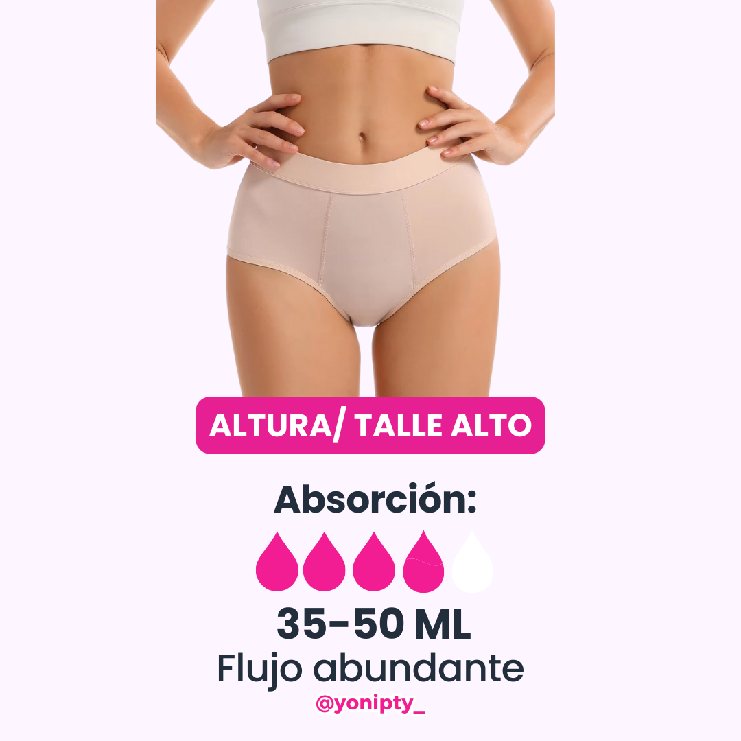 Cuenta con talle alto y una cintura elástica que para una cobertura completa y ajuste seguro. Su capacidad de absorción te garantiza una protección confiable durante todo el día, permitiéndote moverte con libertad y confianza.